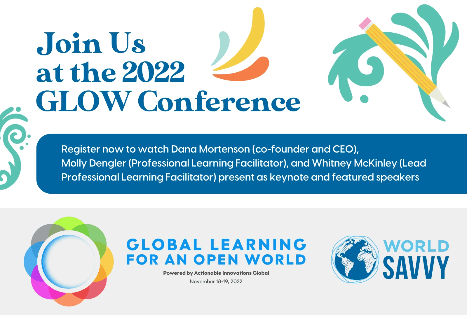 Actionable Innovations Global is hosting the first-ever digital Global Learning for an Open World (GLOW) Conference on November 18th – 19th, 2022. Actionable Innovations Global is a professional learning community for those interested in global education and innovation. World Savvy is thrilled to be featured as the premier partner, in addition to joining the tremendous list of keynote and featured speakers.